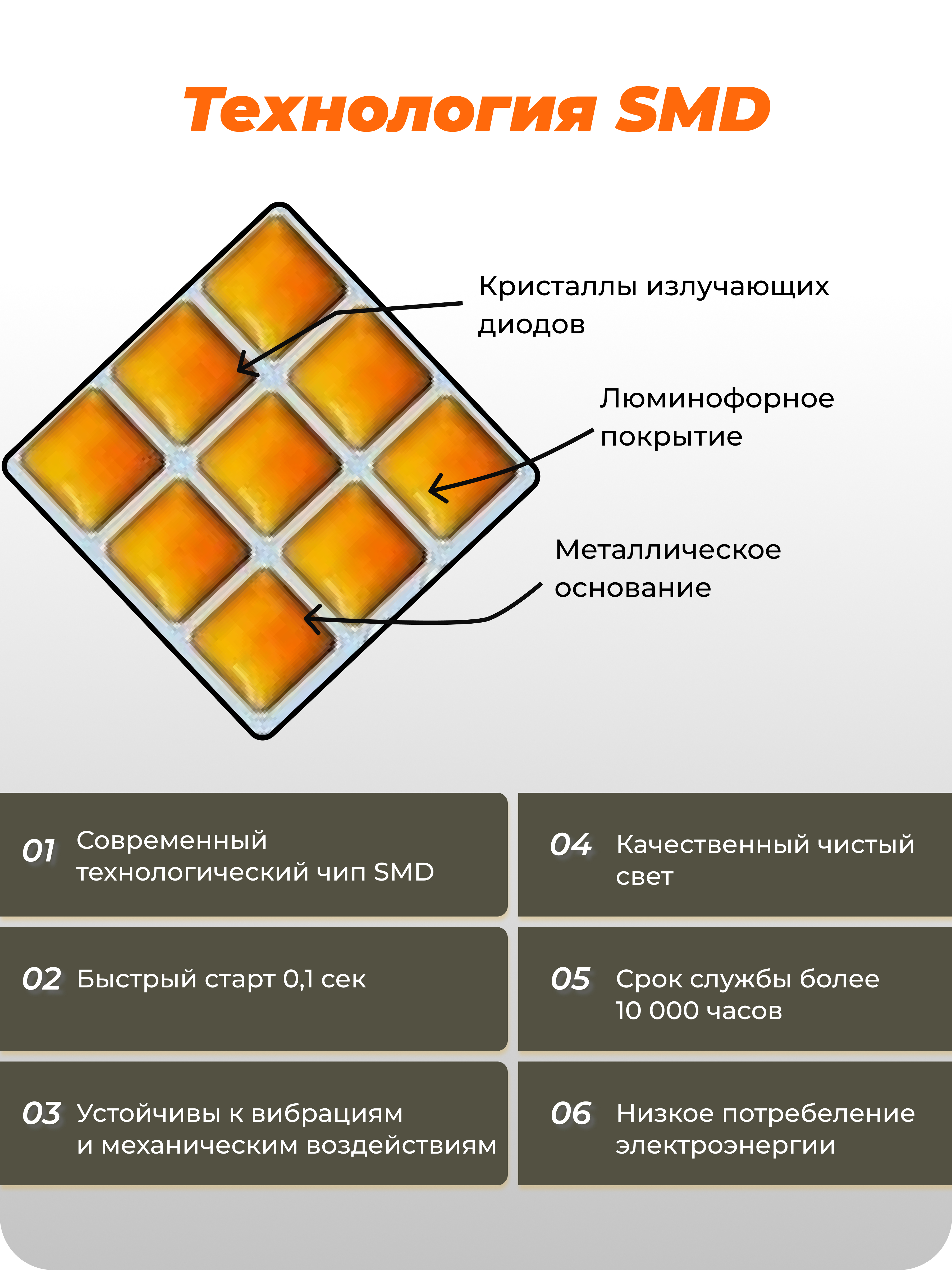 Проектированная для максимальной долговечности, лампа оснащена прочным металлическим корпусом хромового цвета. Её высокий класс пыле-влагозащиты IP65 гарантирует надежную работу в сложных условиях, защищая от попадания воды и пыли. Высокая виброустойчивость до 15,6 Grms (20-2000 Гц) и встроенный кулер охлаждения значительно продлевают срок службы диодов SMD-технологии до 10 000 часов непрерывной работы.