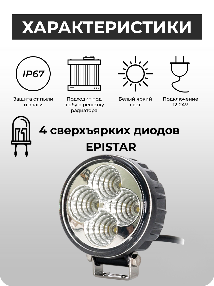 Светодиодная фара FR4-12W flood — это компактное и эффективное осветительное решение, предназначенное для ближнего и рабочего света. Она оснащена высококачественными диодами Epistar 3W (Тайвань), которые обеспечивают яркий световой поток в 1260 люмен. Мощность фары составляет 12 ватт, что делает её экономичным, но при этом достаточно ярким источником света для различных задач.