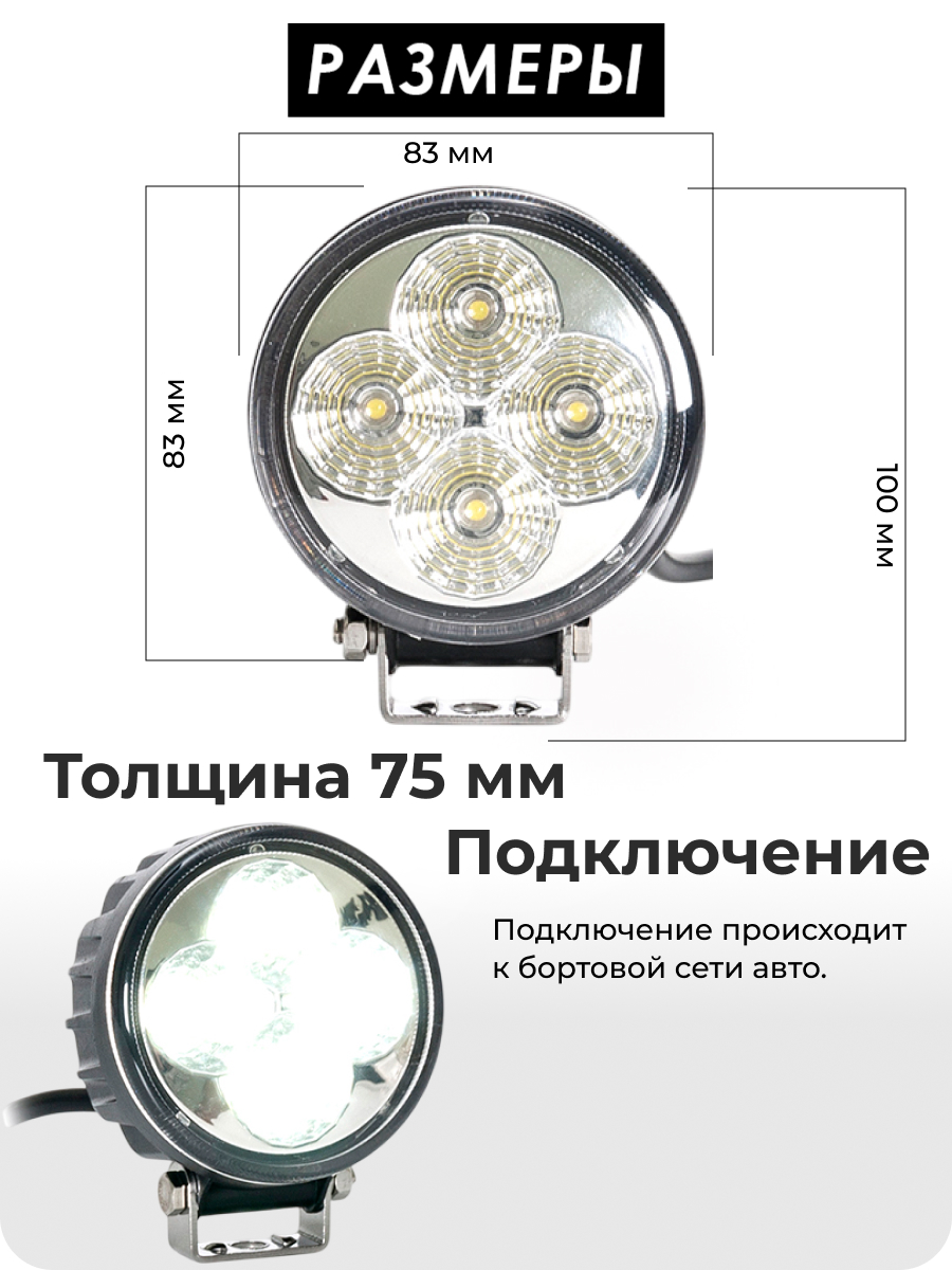 Монтажное крепление с покрытием из нержавеющей стали обеспечивает надежную фиксацию и устойчивость фары даже при сильных вибрациях. Благодаря своим компактным размерам (83 мм в ширину, 83 мм в высоту с креплением 100 мм, и 75 мм в толщину) и весу всего 0,1 кг, фара FR4-12W flood легко устанавливается на различные типы транспортных средств и техники.