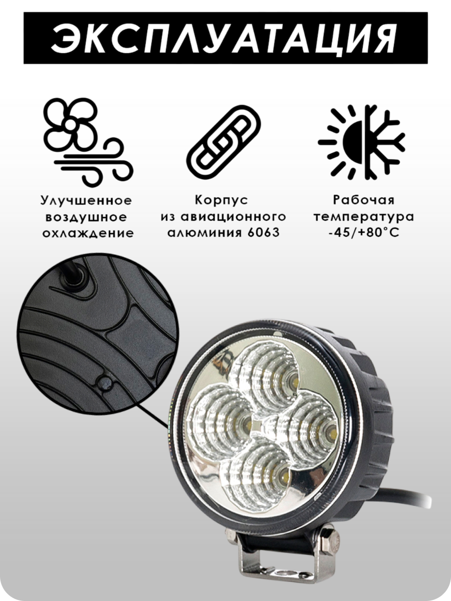 Корпус фары выполнен из прочного литого алюминия с матовым черным покрытием, что гарантирует долговечность и устойчивость к внешним воздействиям. Класс пыле- и влагозащиты IP67 обеспечивает надежную защиту от пыли и воды, позволяя использовать фару в самых разнообразных условиях, включая влажную среду и пыльные дороги.
