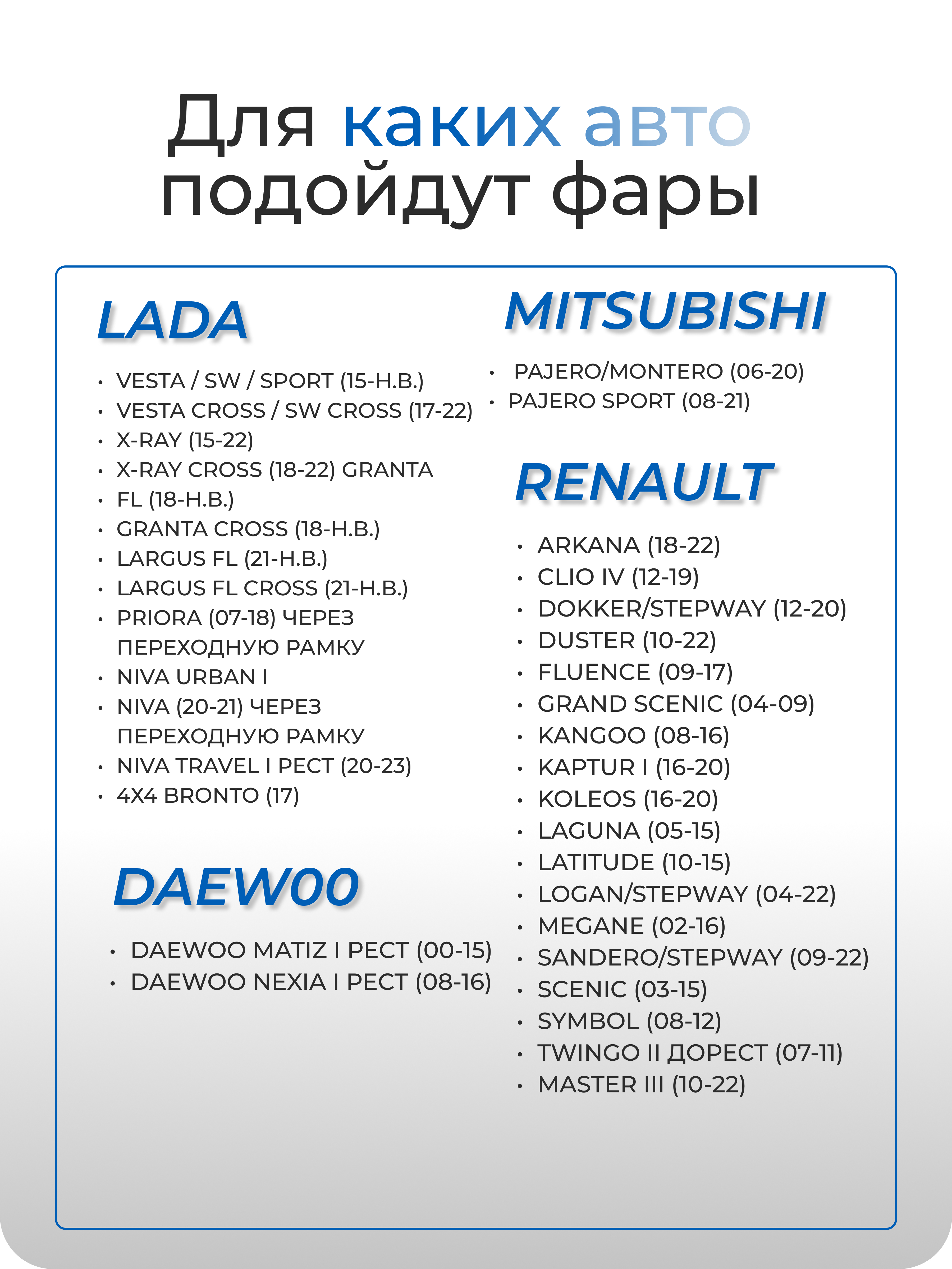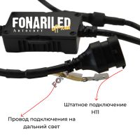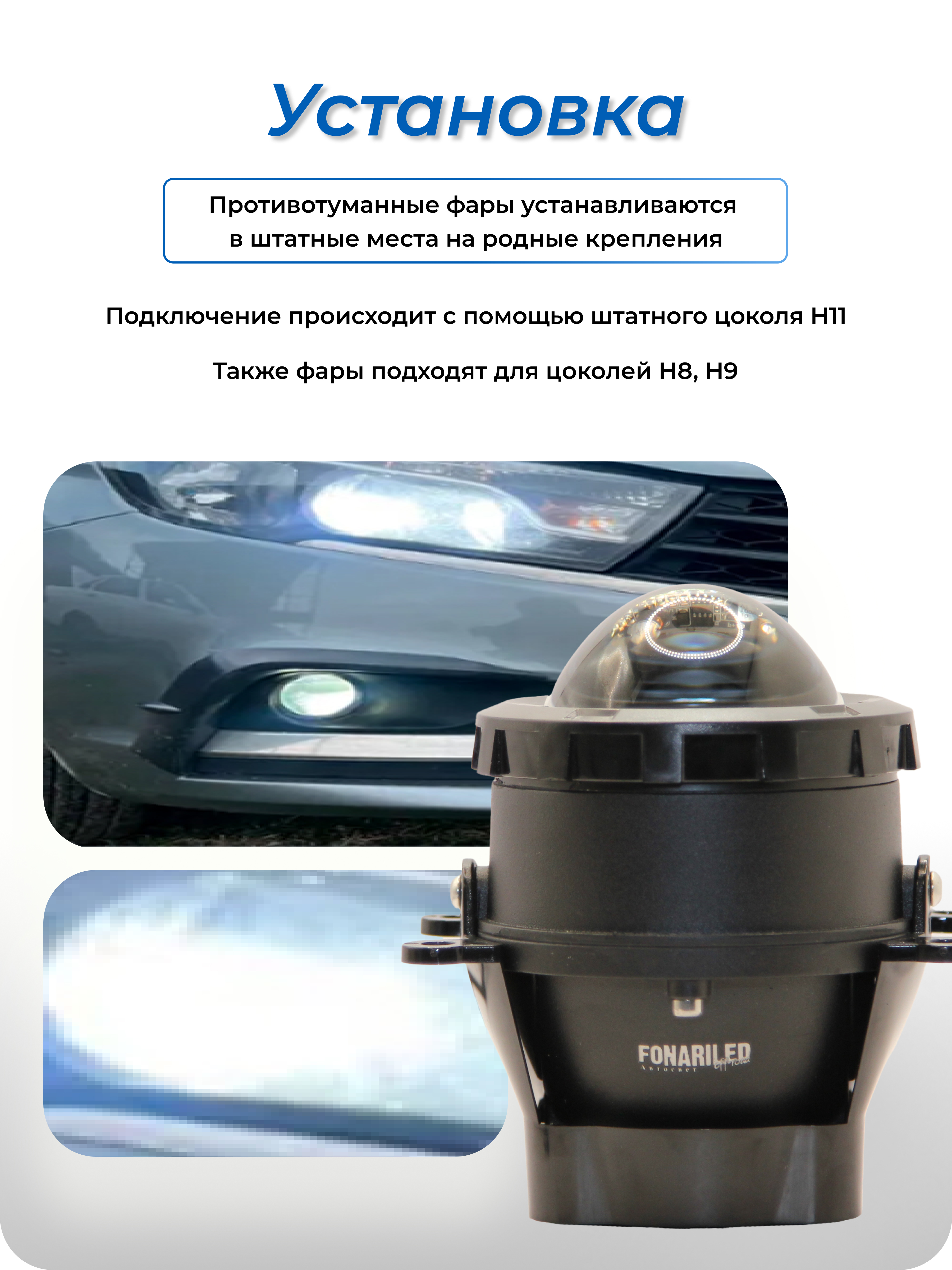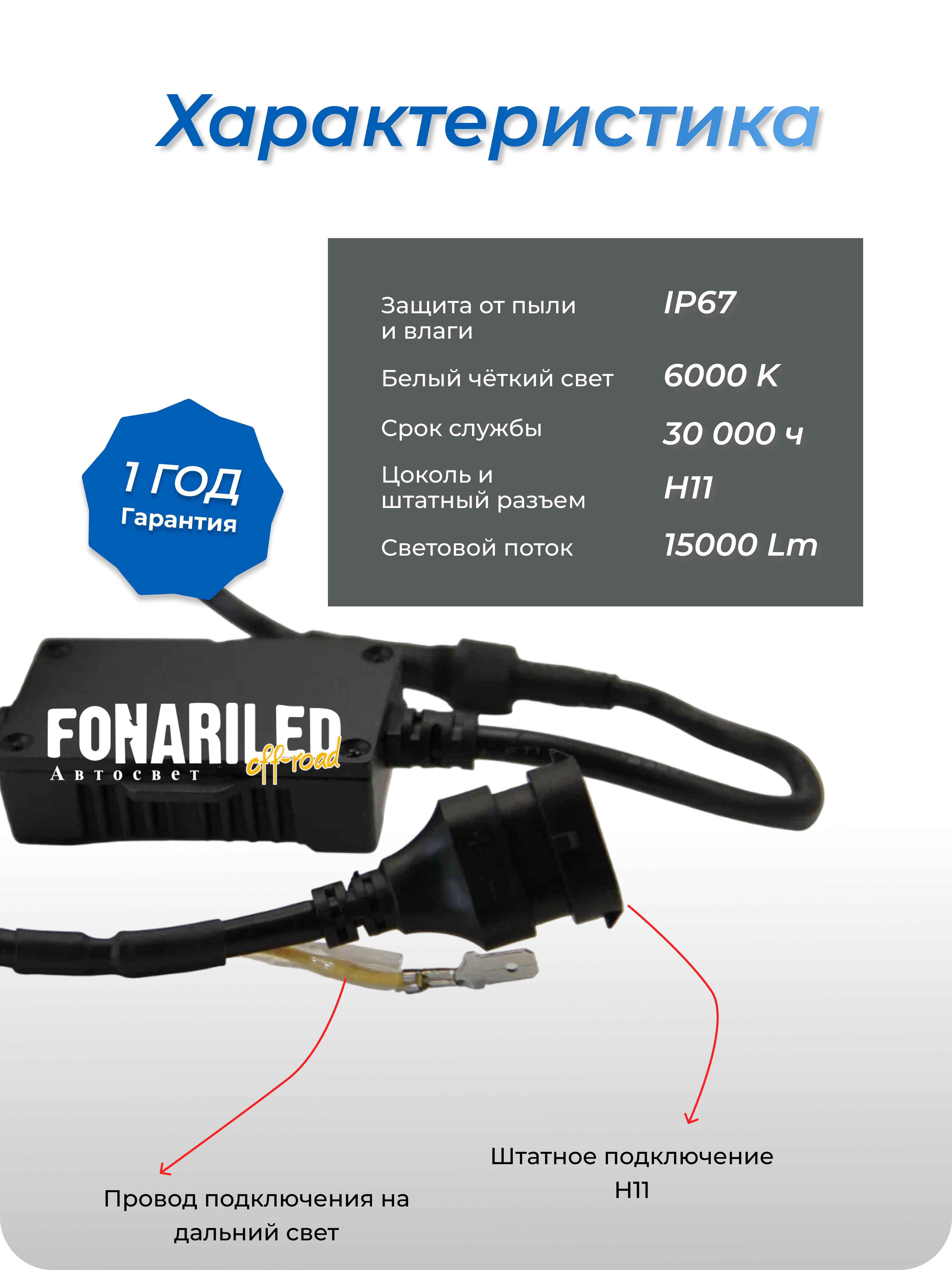 Фары оснащены стандартным цоколем H11, что обеспечивает их совместимость с большинством современных автомобилей. Длина кабеля в 60 см с разъемом позволяет удобно подключить фары к штатной проводке. Монтажное крепление выполнено из прочного пластика, гарантируя надежную фиксацию.