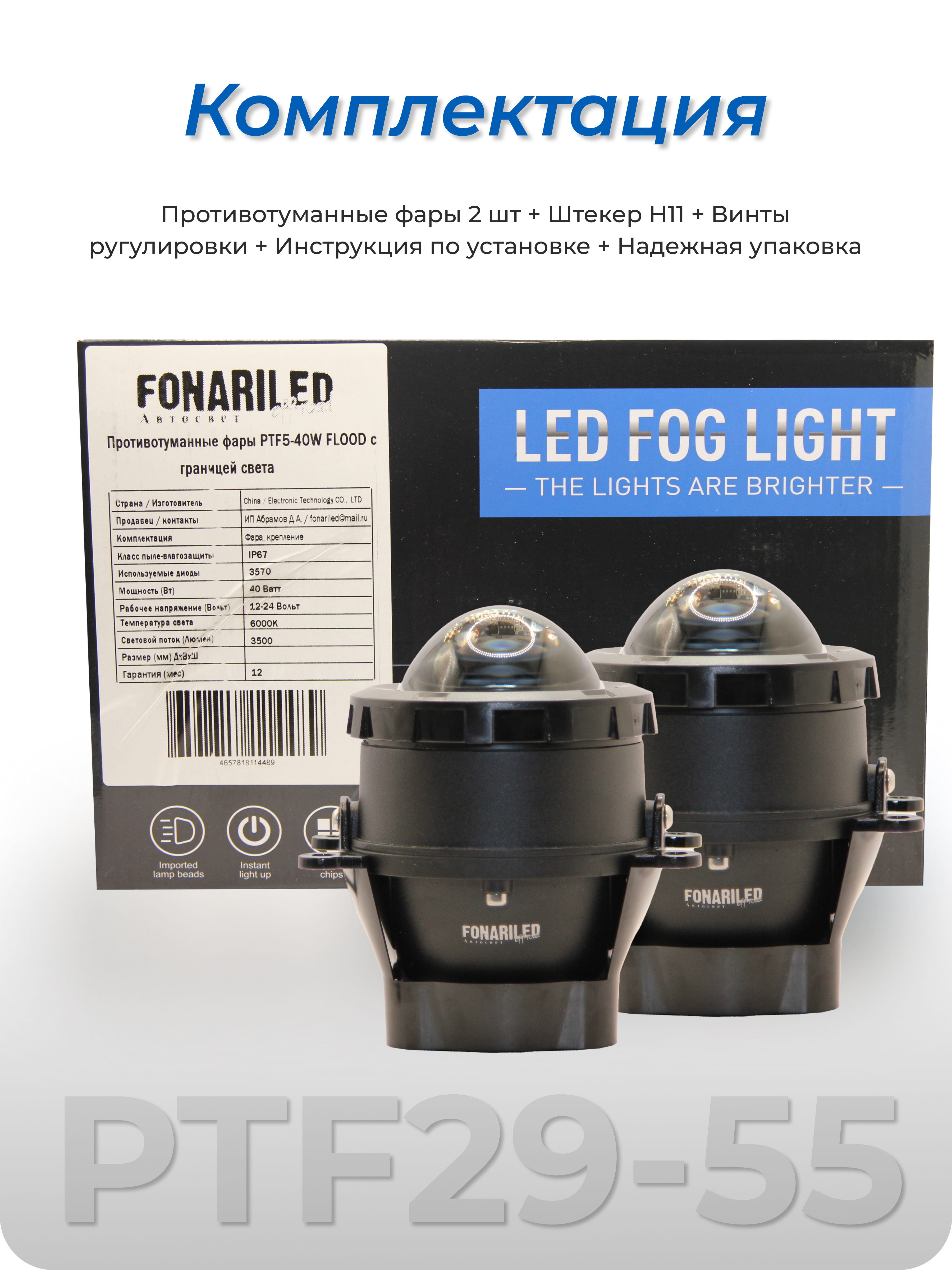 Противотуманные BI-LED фары PTF29-55W COMBO с границей света – это превосходный выбор для водителей, которые ценят безопасность, надежность и высокое качество освещения. Они станут отличным дополнением к штатной оптике вашего автомобиля, обеспечивая уверенность и комфорт в любых дорожных условиях.