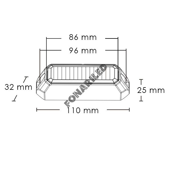 Проблесковый маяк D033 имеет размеры: 110 мм в длину, 25 мм в высоту и 32 мм в ширину.