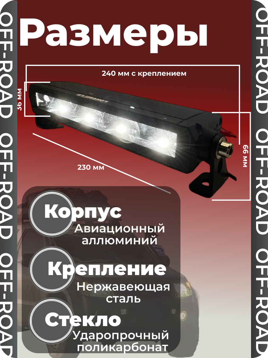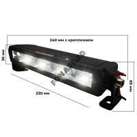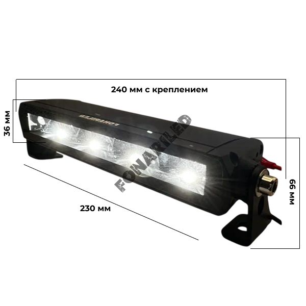 Монтаж светодиодной балки осуществляется с помощью литого алюминиевого крепления, которое входит в комплект. Длина корпуса составляет 24 см, а размеры с креплением — 240 мм в длину и 66 мм в ширину. Благодаря этому, установка балки на автомобиль не займет много времени и не потребует дополнительных усилий.