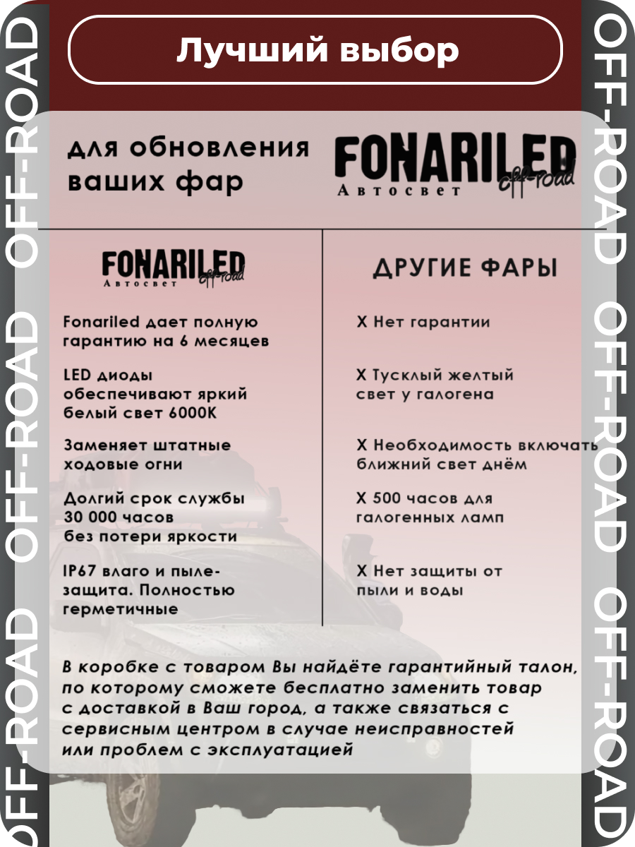 Каждая фара проходит строгий контроль качества, чтобы гарантировать соответствие всем заявленным характеристикам: яркий свет 7000 люмен, долговечность до 30 000 часов и защиту IP67. Безопасность и комфорт вождения — наша приоритетная задача. Удобная установка и универсальное питание 12-24V сделают вашу поездку еще проще и увереннее.