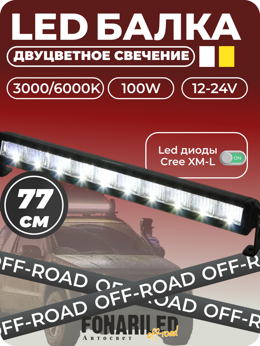 Конструкция корпуса длиной 77 см (765 мм) выполнена из прочного литого алюминия с черным матовым покрытием, которое служит отличным радиатором для отвода тепла. Защитная линза из акрилового стекла отличается высокой прозрачностью и устойчивостью к сколам. Компактная, но мощная балка светодиодная имеет продуманную геометрию, что позволяет легко интегрировать её в бампер, радиаторную решетку или на экспедиционный багажник.
