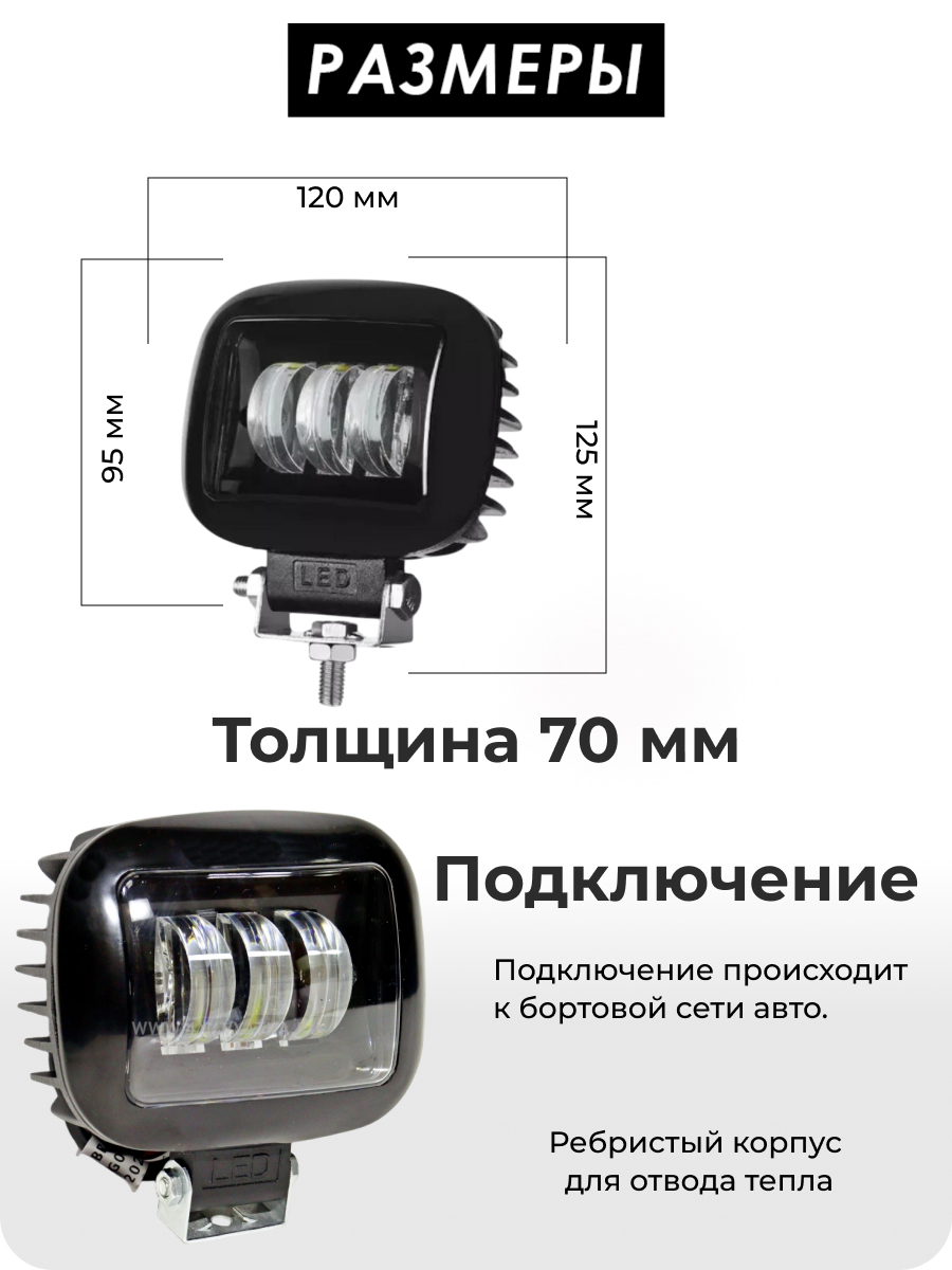 Фара FG3-7D-30W отличается универсальностью в применении благодаря широкому диапазону рабочего напряжения от 12 до 24 Вольт, делая ее совместимой с широким спектром транспортных средств. Монтажное крепление выполнено из металла с нержавеющим покрытием, обеспечивая надежную и долговечную фиксацию. С компактными размерами — ширина 120 мм, высота 95 мм (125 мм с креплением) и толщина 70 мм — а также малым весом в 0,2 кг, фара легко интегрируется даже в ограниченное пространство и не утяжеляет конструкцию автомобиля.
