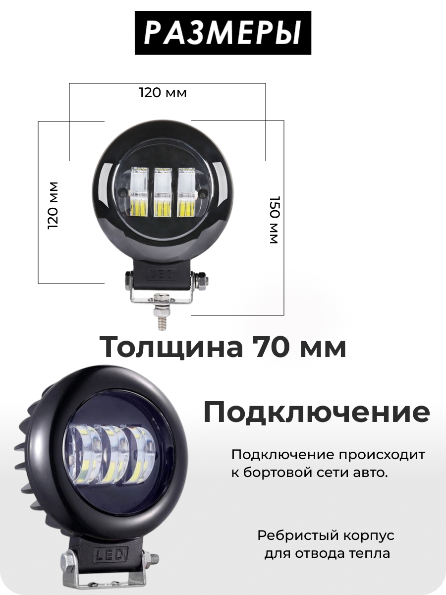 Габаритные размеры фары – ширина 120мм, высота 120мм (с креплением 150мм) и толщина 70мм – позволяют легко интегрировать ее в штатные места или установить дополнительно на различные транспортные средства. Рабочее напряжение 12-24 Вольт обеспечивает совместимость с большинством бортовых сетей. Наличие сертификата ГОСТ Р №0000733 от 12.05.22 гарантирует соответствие фары стандартам качества и безопасности, делая ее надежным и эффективным выбором.