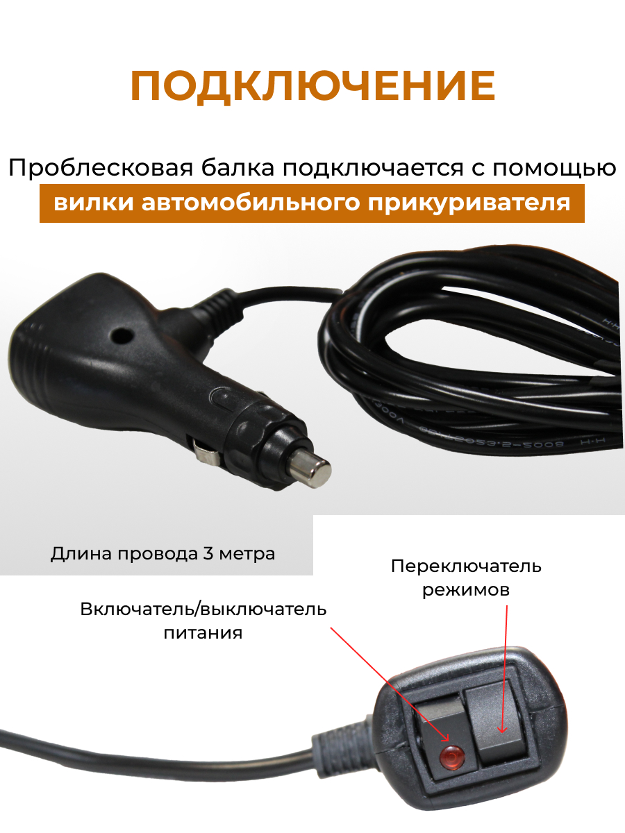 Монтаж балки максимально универсален: её можно закрепить как с помощью мощных магнитов для временного использования, так и стационарно на болты. Модель поддерживает работу в бортовых сетях с напряжением 12-24 Вольт, подключаясь напрямую к автомобильному прикуривателю. Длинный трехметровый кабель обеспечивает удобную прокладку по крыше автомобиля, а вес брутто 1,535 кг делает конструкцию устойчивой и надежной даже при движении на высокой скорости.