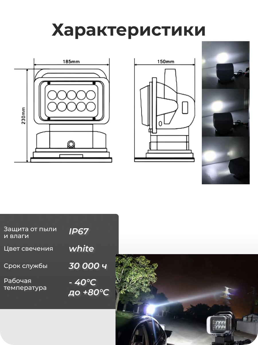 Технические возможности модели впечатляют: при мощности 50 Ватт фароискатель генерирует интенсивный световой поток 4250 Люмен. Температура света 6000K обеспечивает яркое белое свечение, а узкий угол света 30 градусов формирует качественный дальний направленный свет. Благодаря высокому качеству компонентов, заявленная продолжительность времени работы достигает 30 000 часов, что гарантирует долгие годы надежной эксплуатации.
