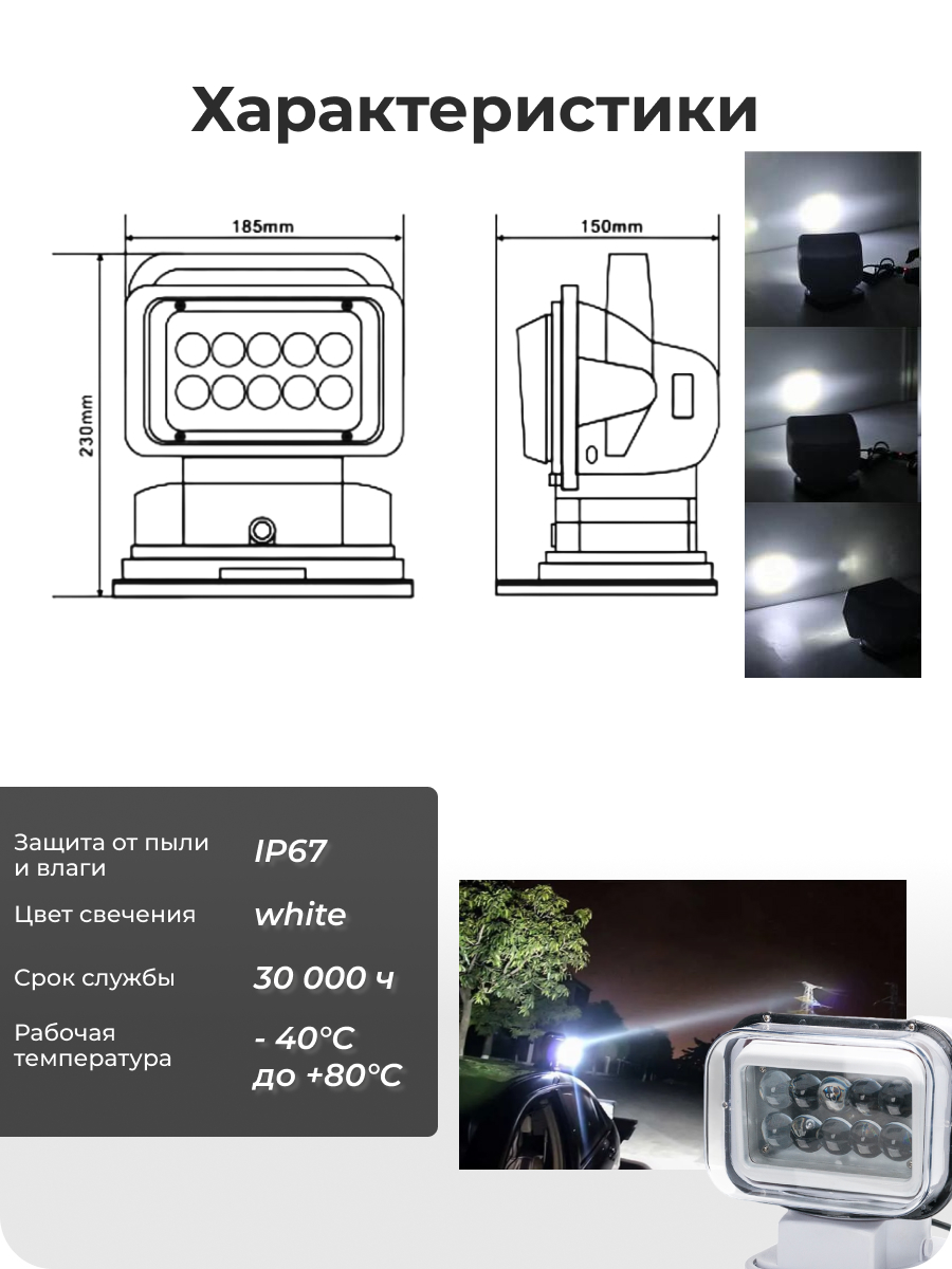 Одной из главных функциональных особенностей модели BW4D-50W является её исключительная маневренность. Механизм вращения обеспечивает полный охват территории на 360 градусов по горизонтали, а угол вертикального наклона составляет 90 градусов. Такая гибкость управления позволяет оперативно менять направление светового потока, подсвечивая нужные зоны без необходимости перемещения самого транспортного средства. Устройство весом 3,3 кг обладает отличной балансировкой и устойчивостью, сохраняя заданное положение луча даже при активной эксплуатации.