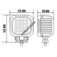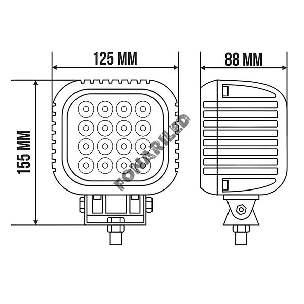 - Размер светодиодной фары — ширина 123 мм × высота 112 мм (145 мм с креплением), толщина 85 мм.