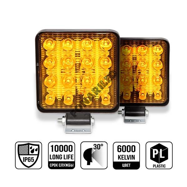 Модель FR16YS-48W SLIM светит жёлтым (orange). Корпус фары пластиковый. Фары светят достойно, благодаря установленным 16 диодам SMD 3030 по 3 Ватта каждый. Рабочее напряжение 12-24 Вольт. Корпус сделан из высокопрочного литого алюминия. Монтажный кронштейн изготовлен из железа.