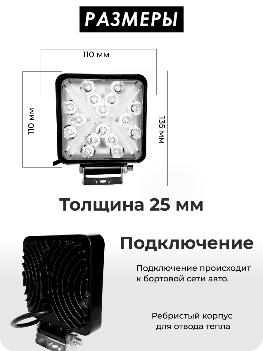 Фара имеет компактные размеры: ширина 110 мм, высота 110 мм (с креплением 135 мм) и толщина 25 мм. Монтажное крепление выполнено из нержавеющего металла, что обеспечивает надежную фиксацию и устойчивость к коррозии. Рабочее напряжение 12-24 Вольт делает фару совместимой с большинством транспортных средств и оборудования. Продолжительность службы составляет до 30 000 часов, что гарантирует долгий срок эксплуатации без необходимости частой замены.