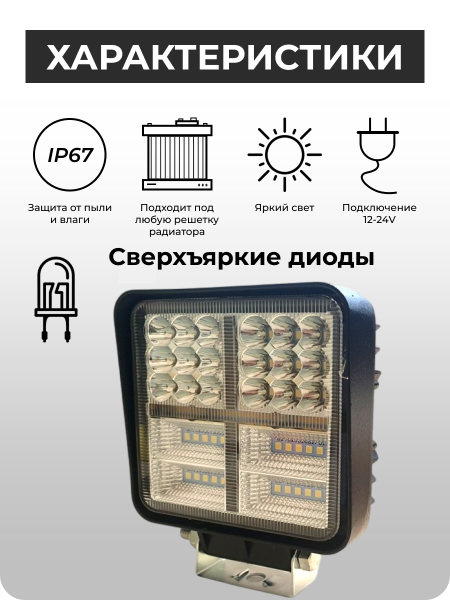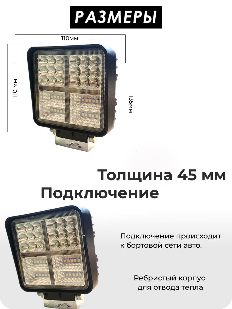 Представляем высокопроизводительную светодиодную фару, разработанную для обеспечения мощного и эффективного освещения. Оснащенная передовой технологией диодов Philips, эта фара обладает впечатляющей мощностью в 114 Ватт, генерируя интенсивный световой поток в 3360 люмен. Она излучает чистый белый свет с температурой 6000K, значительно улучшая видимость и комфорт в самых разных условиях вождения. Широкий угол света в 60 градусов гарантирует обширное и равномерное покрытие дорожного полотна, а компактные размеры — 110 мм в ширину и высоту (135 мм с креплением) при толщине 45 мм — обеспечивают универсальность установки на различные транспортные средства.