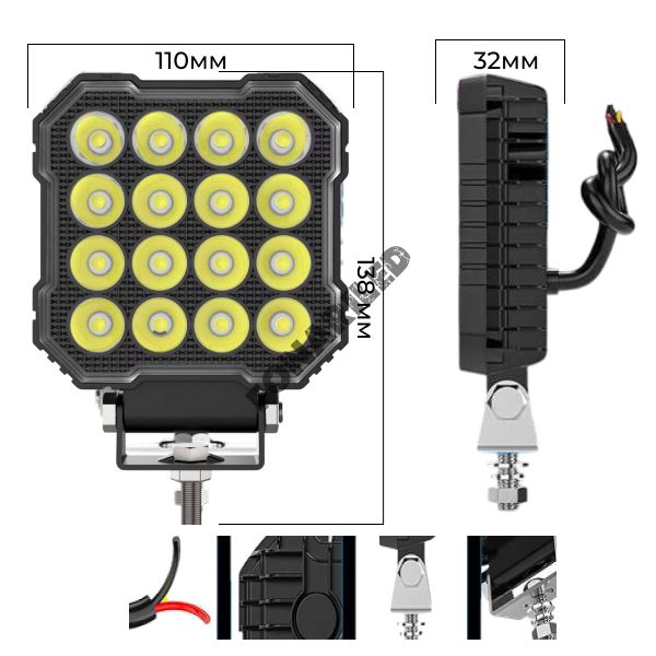 Фара оснащена прочным монтажным креплением с нержавеющим покрытием, что обеспечивает надежную и долговечную фиксацию. Длина кабеля 27 см упрощает процесс установки. Устройство работает в широком диапазоне рабочего напряжения от 12 до 24 Вольт, что делает его совместимым с большинством видов транспорта, включая автомобили, спецтехнику и квадроциклы. Компактные размеры (Ширина 110 мм * Высота 110мм (с креплением 135мм) * Толщина 32мм) и небольшой вес брутто (0,4 кг) позволяют легко интегрировать фару в различные конструкции.