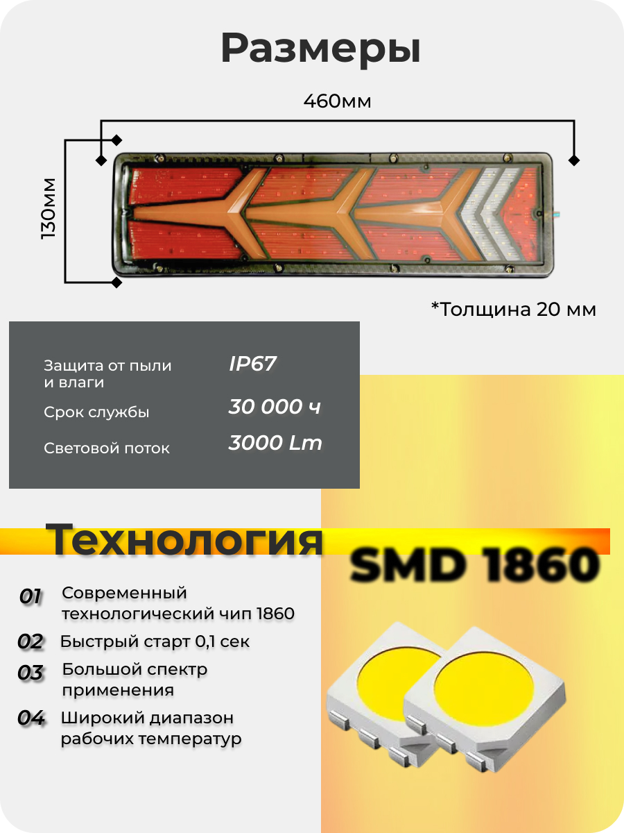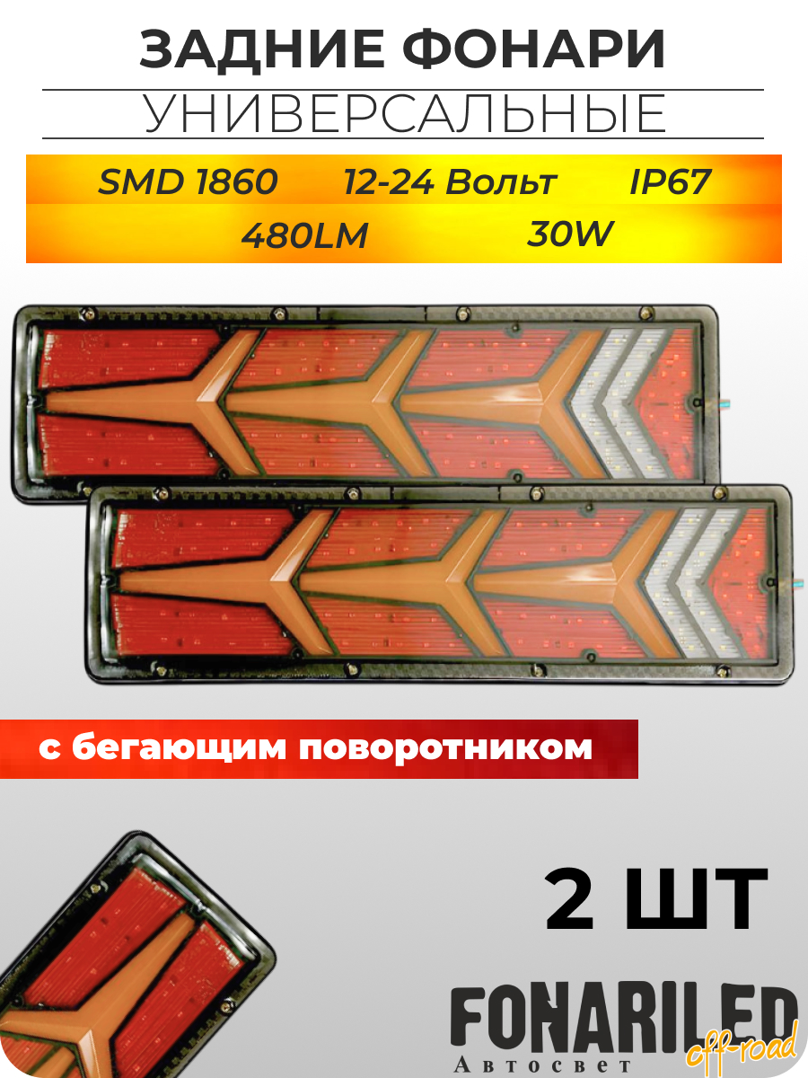 Представляем задние LED фонари FS-2046, разработанные для современных транспортных средств, которым требуется повышенная безопасность и стильный внешний вид. Эти универсальные фонари поддерживают широкий диапазон рабочего напряжения от 12 до 24 Вольт, что делает их совместимыми с различными типами автомобилей, от легковых до грузовых. Главной особенностью является динамический режим "бегающего поворотника", который обеспечивает яркую и последовательную индикацию направления, значительно повышая заметность автомобиля на дороге. В основе конструкции лежат высокоэффективные диоды по технологии SMD 1860, интегрированные в прочный, но гибкий корпус из ПВХ с металлическими элементами, а общие размеры составляют 460 мм в длину, 130 мм в ширину и 20 мм в высоту при весе брутто 1 кг.