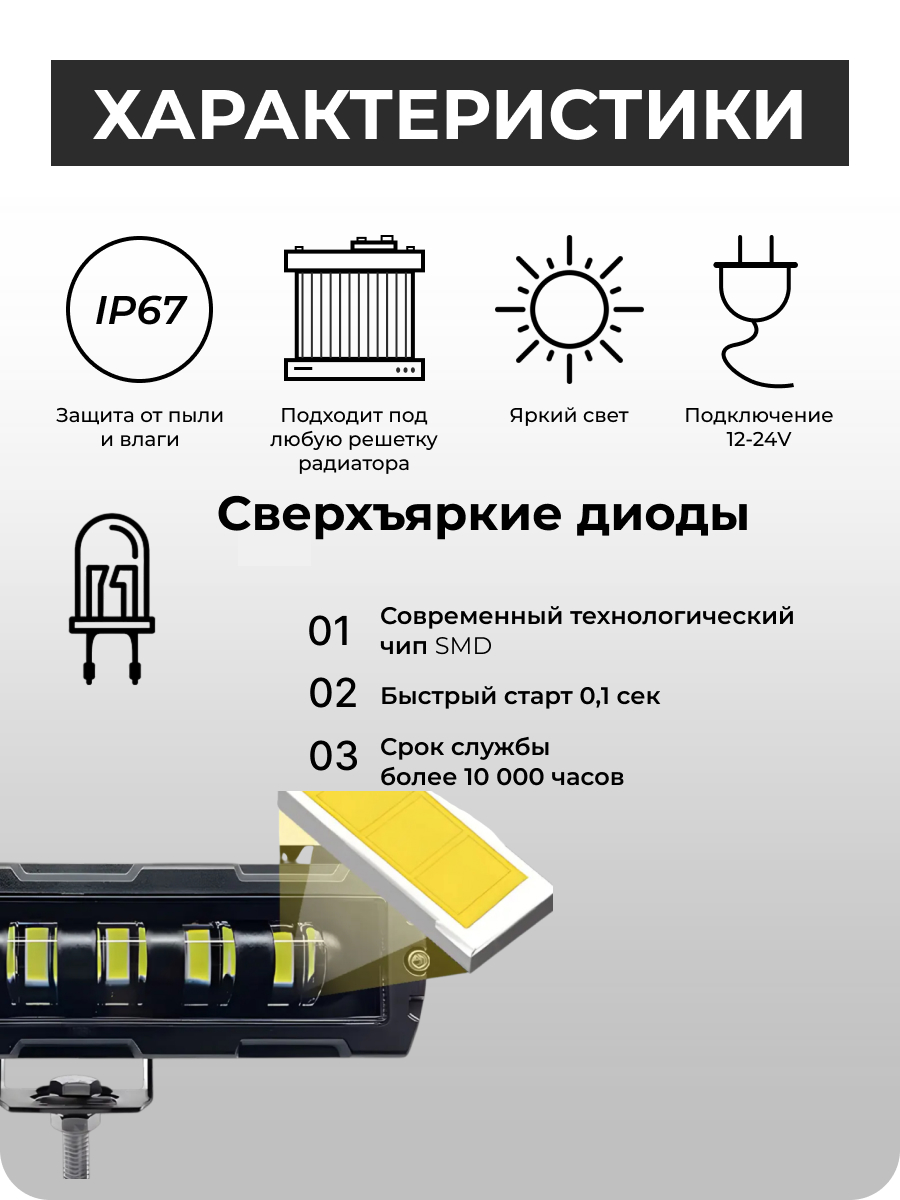 Каждая фара проходит строгий контроль качества, чтобы гарантировать соответствие всем заявленным характеристикам: яркий свет 7000 люмен, долговечность до 30 000 часов и защиту IP67. Безопасность и комфорт вождения — наша приоритетная задача. Удобная установка и универсальное питание 12-24V сделают вашу поездку еще проще и увереннее.